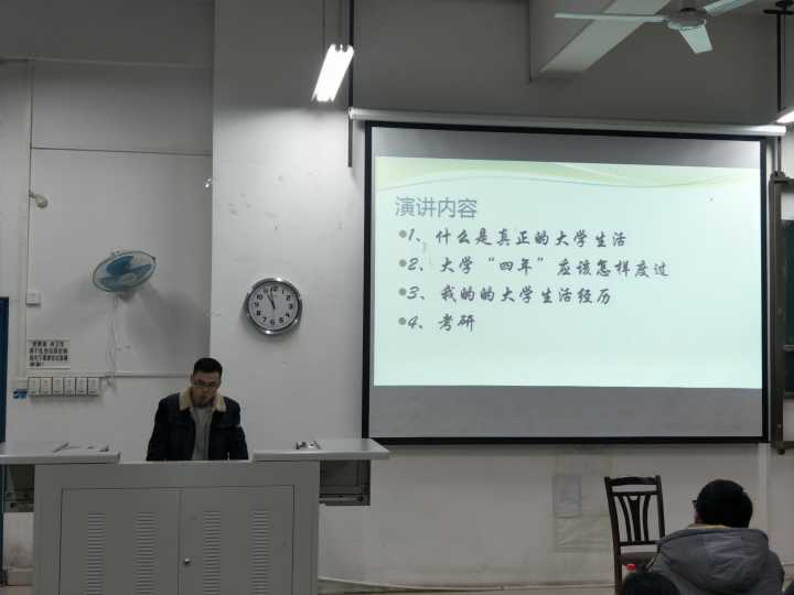 赵鹏飞先从自己的大学生活切入,向同学们讲述什么是真正的大学生活,然后对应该如何度过大学四年时光提出了宝贵的建议。他认为大学是让人储备丰富专业知识及锻炼扎实专业技能的地方。同学们首先是要搞好学习,其次可以有选择性地加入一到两个社团或组织,平时多去图书馆看书,扩展自己的知识面,在日常生活中做一个“有心人”,多关注自己专业领域的发展及就业等方面,为将来的工作做准备,也可以根据自己的爱好学一门技能,将其变为自己突出的特长,这能让我们在就业竞争中具有更大的优势。赵鹏飞对同学们为什么要考研作了详细的分享。他认为,考研不仅可以圆同学们曾经想考名牌大学的梦,也可以进一步深造,精研自己的专业,以后有一个好的前程等诸多益处。考研对同学们是一个很好的选择。最后,赵鹏飞学长告诉同学们考研应立足于现在,大一就可进行考研的准备,注重知识的积累。同时,他希望同学们能不忘初心,在2022年6月拿到毕业证书的那一刻还能想起“我为什么来读大学”。
