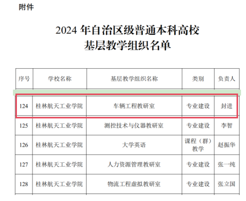根据《自治区教育厅办公室关于公布2024年自治区级普通本科高校基层教学组织名单的通知》(桂教办〔2024〕941号),我院车辆工程教研室被认定为自治区级普通本科高校基层教学组织。