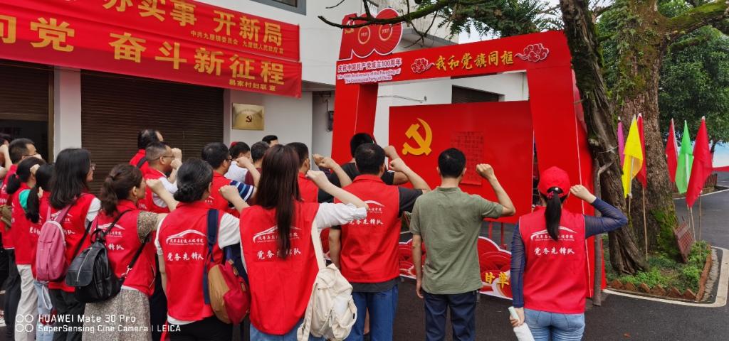 第一站党员们来到隶属于广西灵川县九屋镇的甘草村。在村书记的带领下,走进甘草村,感受新农村的变化及脱贫攻坚的成果。在甘草村中党员们面向鲜红的党旗,在教师党支部王曙道书记的带领下重温入党誓词。
