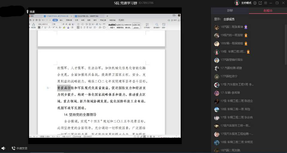 11月13日晚,汽车与交通工程学院学生党支部集中学习十九届五中全会精神,本次线上课程由我院学生党支部书记马楠主持,2018级辅导员杨帆与我院全体学生党员参加学习。