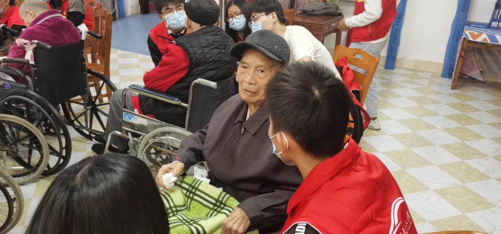 随后在学生们的陪同下,老人返回了房间,在房间里,我们进一步了解到了老人们的生活状况。有的老人十分骄傲地介绍自己党员纪念徽章,有的老人因行动不便无法下床,学生们便在护工的陪同下给老人喂饭,陪老人看电视聊家常。