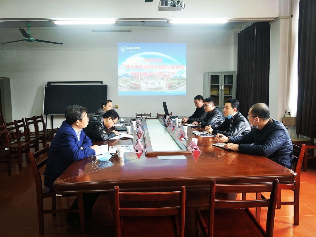 4月22日广西玉柴机器股份有限公司工程研究院副院长寇传富、广西玉柴机器股份有限公司人力资源部招聘高级经理刘启才、广西欢创人力资源有限公司总经理蒋仕东来我院洽谈校企合作事宜。人文素质与创新创业学院副院长李智、我院党总支副书记李迪辉、学院副院长陈元华、学工部(处)就业科长王继波出席本次洽谈会。