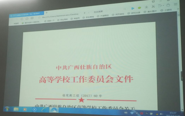 会议第二项由李迪辉书记组织全体党员教工学习区高校工委下发文件《关于加强广西高等学校院(系)党组织建设的意见》。李迪辉书记从当前高校党建形式和总体要求出发,就学院党建会议制度、党风廉政建设、党支部建设、党员发展工作等各方面对文件进行了解读。