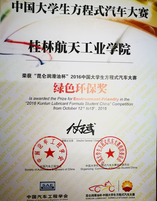 在四个比赛日内我校航V车队顺利完成设计分析、制造成本分析、营销报告三个静态项目,以及直线加速、8字绕环、高速避障、耐久赛、燃油经济性五个动态项目共计八个项目的比赛。本次大赛各车队赛车序号由组委会组织抢答赛确定,经抢答,我校参赛赛车序号确定为67号。与我国成立67周年契合的我校参赛赛车成为动态赛场上一道靓丽的风景。经过四天紧张激烈的争夺,最终,我校航V车队以总成绩623.41分获得2016中国大学生方程式汽车大赛第21名,较去年提升22名。又因我校航V 2号赛车在燃油经济性和噪声方面的优异表现,获得组委会颁发的唯一“绿色环保奖”。