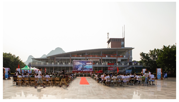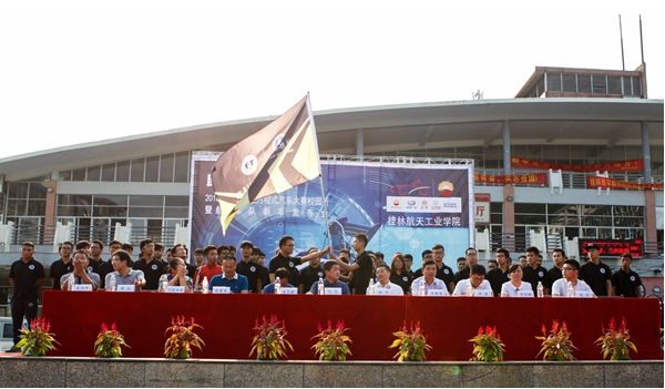 杨杰、沈克共同为“航V二号”新车揭幕,杨杰为赛车贴上号牌,舞台中央,今年的参赛队员接过队旗,车队成员集体宣誓桂航精神和车队精神。
