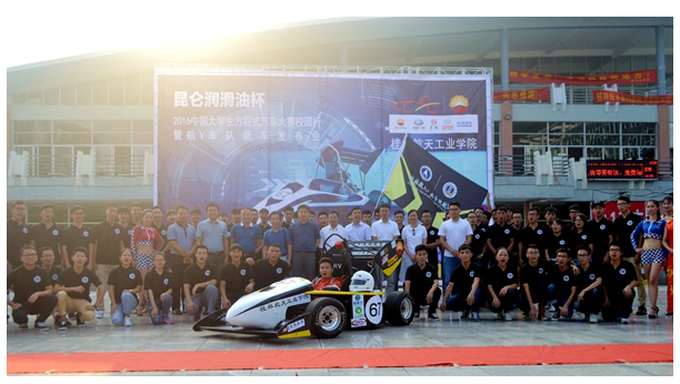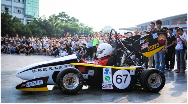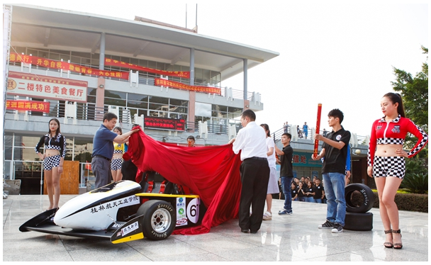9月20日下午,由我校师生自主创新设计制造的方程式赛车“航V二号”新车正式对外发布。我校副校长杨杰、中国汽车工程学会副秘书长沈克,汽车与交通工程学院、传媒与艺术设计系、教务处、学工部负责人,广西桂林东城汽车销售服务有限公司总经理许丽琳、桂林天成车业服务有限公司董事长经孝勇,FSC大赛组委会、中国石油报、昆仑润滑油公司嘉宾出席发布会。