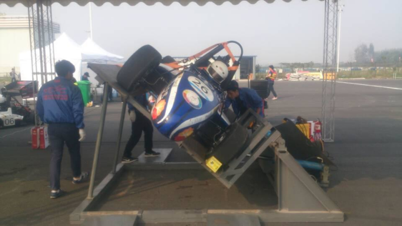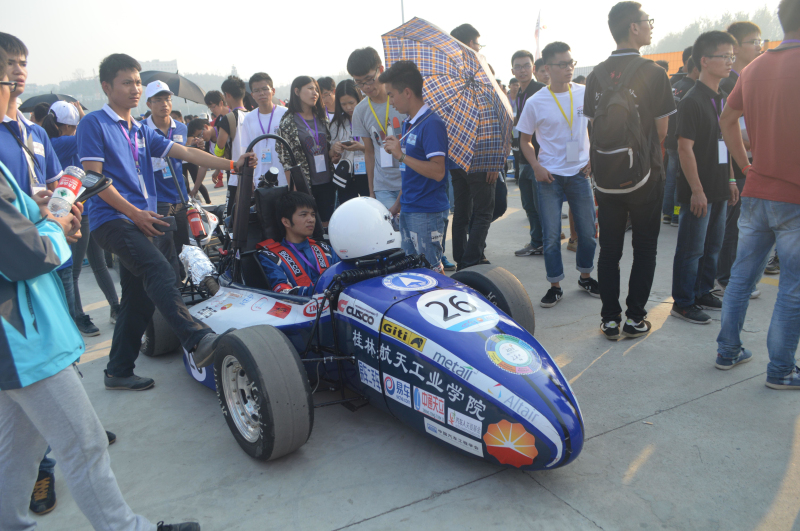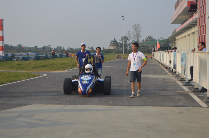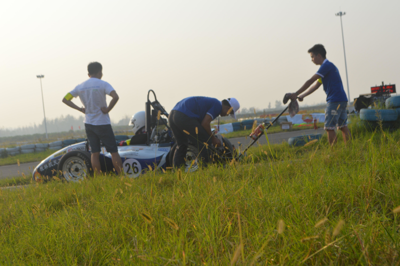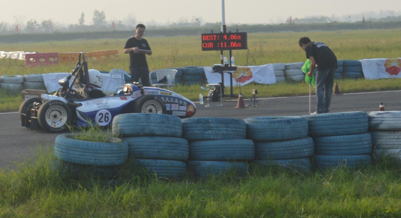 听到前线传来此消息,大家的心情都不自禁的悬了起来,因为我们都知道,如果今天过不了三检,意味着我们不能参加直线测试甚至以后的其他项目比赛。这样大家就开始分工,有的学生开始求救于其他车队借消音器,有的老师带领学生外出购买降噪消声材料。经过大家的努力,终于在14:39传出噪检通过的声音,大家心里的石头终于落下课了,很快我们就全部通过全部车检进行动在15:45我们赛车来到75米直线加速的赛道上,车手黄振旭开始第一次跑动,跑出4.95秒的成绩,打破平常训练的好成绩。在16:25由唐建森进行8字绕环的项目比赛,跑出5.52秒的单圈最快成绩。