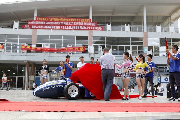9月16日下午,由我院师生自主创新设计制造的方程式赛车“航V1号”新车正式对外发布。副校长李智,汽车与交通工程学院、传媒与艺术设计系、学工部、校团委主要负责人,以及桂林真龙福福汽车销售有限公司董事长谢庆均、桂林博达汽车科技有限公司总经理黄景中、桂林旅游汽车运输公司总工程师梁荣德、广西艾盛创制科技有限公司部长王彬出席发布会。