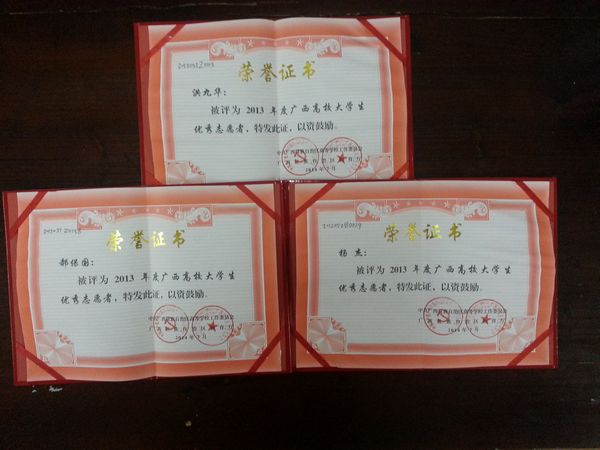 本次评选活动旨在弘扬“奉献、友爱、互助、进步”的志愿精神,广泛普及服务他人、奉献社会的志愿服务理念,广西区各高校共评选出10名“2013年度广西高校大学生志愿者年度人物”,12名“2013年度广西高校大学生志愿者年度人物入围奖”,77名“2013年度广西高校优秀大学生志愿者标兵”,984名“2013年度广西高校优秀大学生志愿者”,98项“2013年度广西高校优秀大学生志愿服务项目”。希望受表彰的个人珍惜荣誉、戒骄戒躁,不断服务创新。希望我系更广大的同学们能够以这三位同学为榜样,让自己的人生价值在志愿活动中得到体现,增强社会责任感,让自己的身心及精神境界得到升华。