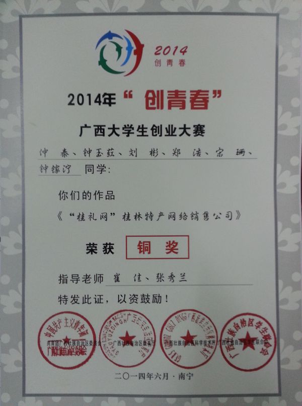 近日,由共青团广西区委、自治区教育厅、自治区科技厅、广西学联共同主办的2014年“创青春”广西大学生创业大赛传来佳讯,我系学生在比赛中喜获佳绩,其中获银奖1项、铜奖1项。