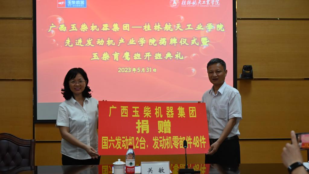 会上,关敏代表玉柴集团向学校捐赠了国六发动机等教学设备,并为“玉柴育鹰班”授了班旗。