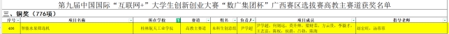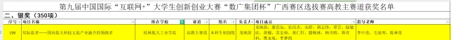 2023年度第九届中国国际“互联网+”大学生创新创业大赛“数广集团杯”广西赛区选拔赛获奖名单,我院李中焘老师指导的项目——《星际旅者——国内航天科技文旅产业融合的领跑者》荣获区赛银奖;赵宏旺老师指导的项目——《智能水果筛选机》荣获区赛铜奖。