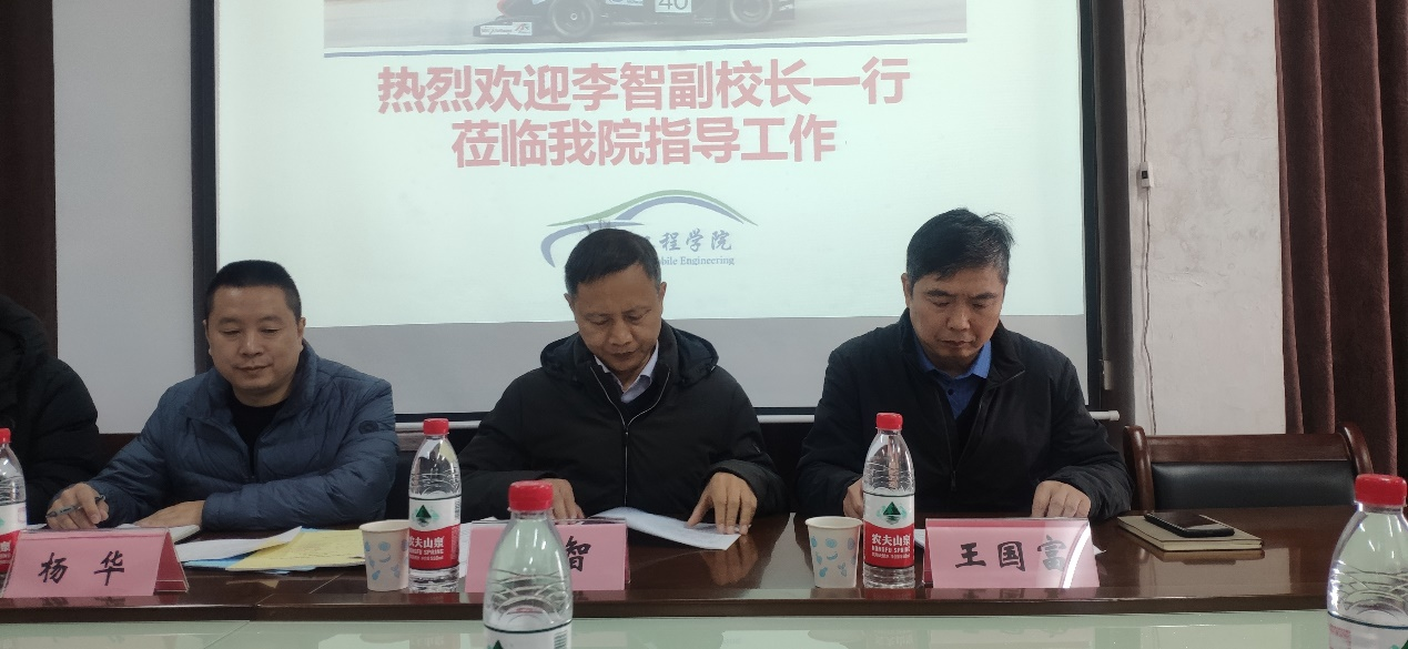 12月5日,李智副校长在教务处领导的陪同下莅临我院,对我院汽车后市场产业学院的建设工作进行了检查和指导。学院院长陈元华、副书记李中焘和副院长莫德赟参加了会议。