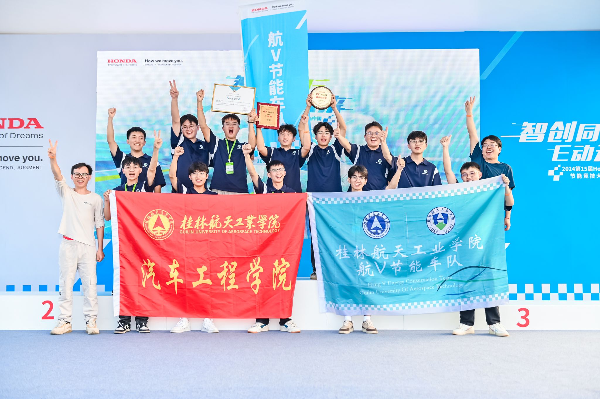 2024年11月18日,由伟德国际1949始于英国郭华礼老师和万运斌老师率领的桂林航天工业学院“航V节能车队”于珠海国际赛车场参加第15届Honda中国节能竞技大赛。本次共有来自于北京理工大学、吉林大学等19支高校组的节能车队,以及来自广汽本田汽车有限公司、东风本田汽车有限公司等16支企业组的节能车队共同参赛。经过11月18日正式比赛日的激烈角逐,我校航V节能车队荣获二等奖。