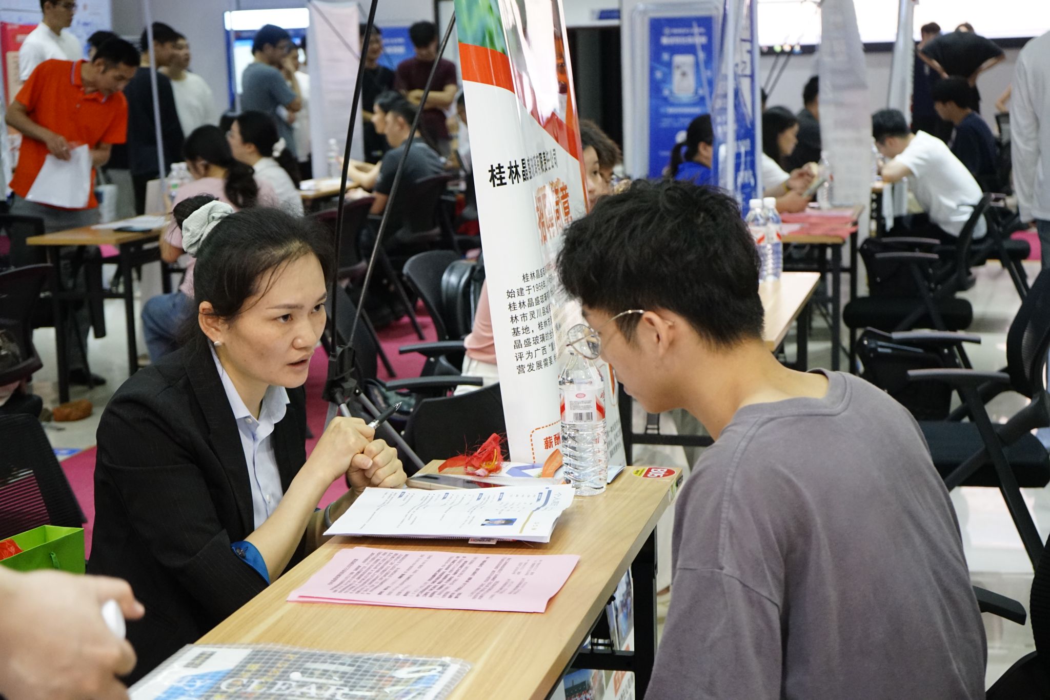 招聘会现场,包括华安财产保险、杭州绿传科技、广西车猫科技有限公司、益伸集团等知名企业在内的22家用人单位设立展位,与毕业生面对面交流。线上企业如奇瑞汽车、玉柴华原等同步开启“云招聘”,方便异地学生投递简历。值得一提的是,灵川人社局作为政府单位参会,为毕业生提供政策咨询和基层就业指导,进一步拓宽就业渠道。活动吸引了近500名2025届毕业生到场,学生们手持精心准备的简历,积极与企业代表沟通,了解行业趋势和岗位要求。