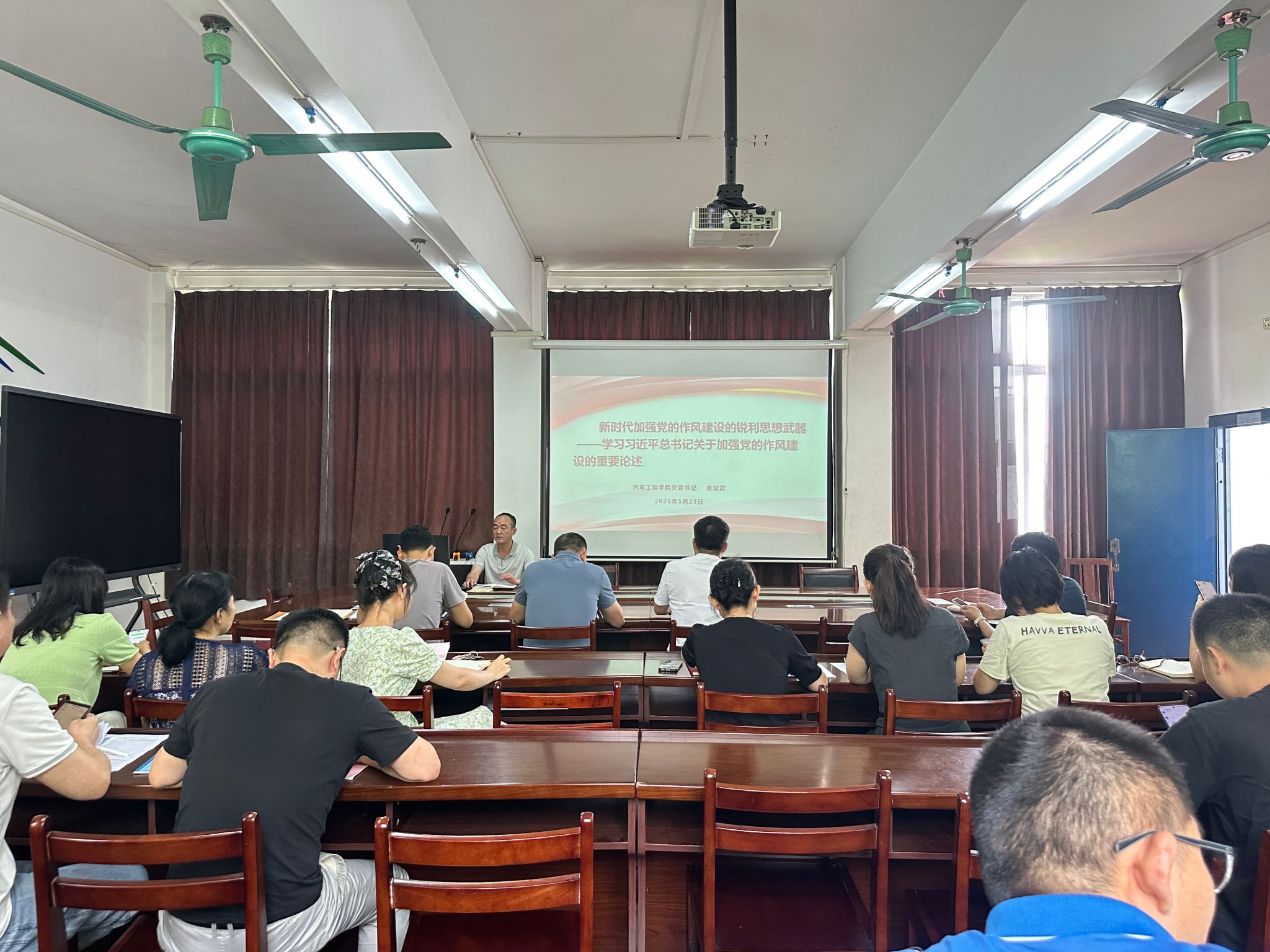 为进一步贯彻落实中央八项规定精神,2025年5月23日下午,学院党委书记吉斌武同志以《新时代加强党的作风建设的锐利思想武器——学习习近平总书记关于加强党的作风建设的重要论述》为题,为全体教师党员上了一堂深刻且生动的专题党课。
