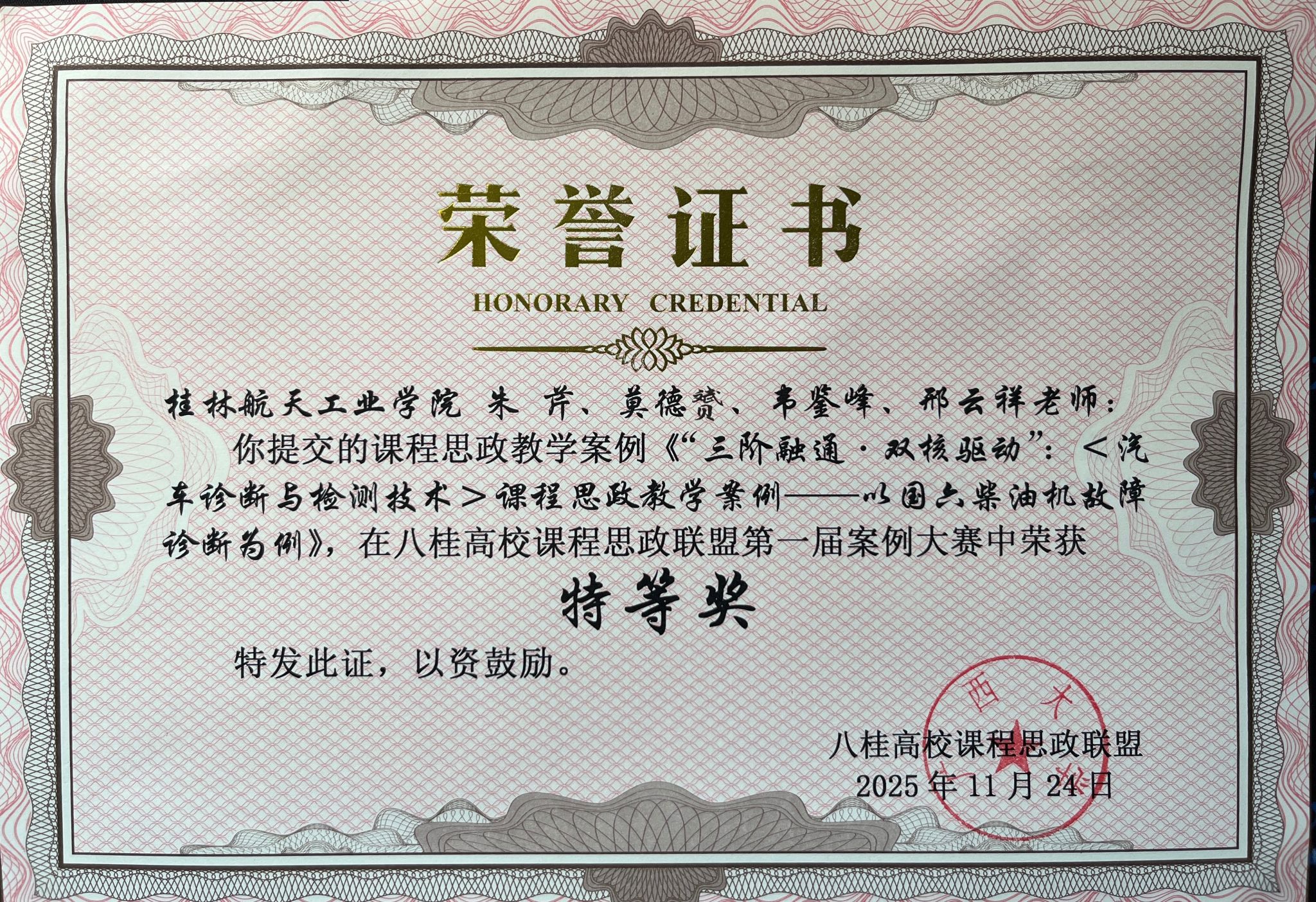 朱芹、莫德赟、韦鉴峰、邢云祥老师团队的案例《“三阶融通·双核驱动”:<汽车诊断与检测技术>课程思政教学案例——以国六柴油机故障诊断为例》荣获特等奖;