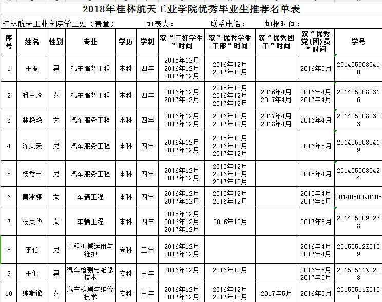 我院2018年桂林航天工业学院优秀毕业生推荐名单表公示,也可点击附件下载查看
