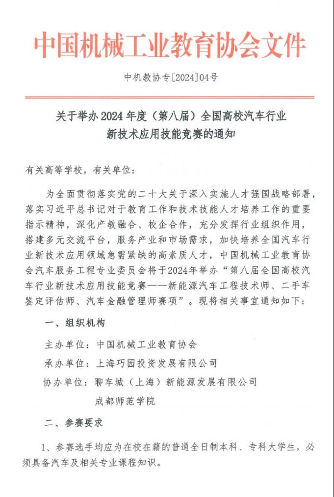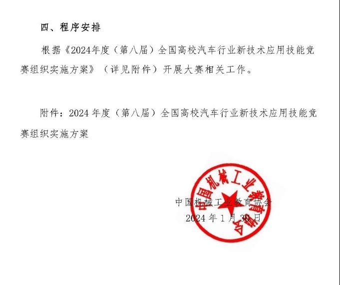 附:《关于举办2024年度(第八届)全国高校汽车行业新技术应用技能竞赛的通知》(中机教协专[2024]04号)