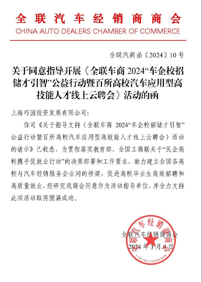 附:关于开展《全联车商2024“车企校招储才引智”公益行动暨百所高校汽车应用型高技能人才线上云聘会》活动的函(全联汽商函〔2024〕10号)