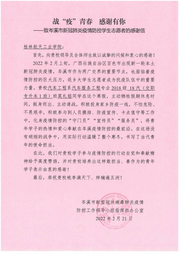 近日,我院收到一封来自岑溪市新冠疫情防控工作领导小组指挥部办公室的感谢信,对我院汽车服务工程专业学生莫礼铭勇敢逆行、积极主动参与岑溪市疫情防控志愿服务活动表示感谢。