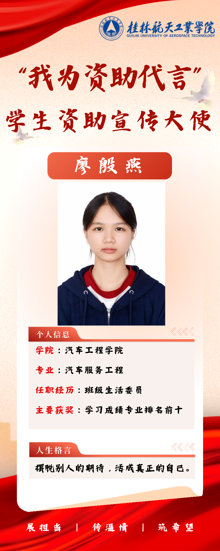 回望大学时光,她用“蜕变”二字概括自己的成长历程,在专业学习上,她坚持“今日事今日毕”的原则,并取得专业排名前10的优秀成绩;在实践锻炼中,她积极参与学科竞赛和志愿服务,此外,她参加各类学术讲座和社团活动,拓宽视野,提升综合素质,逐渐从青涩懵懂成长为自信坚定的大学生。对于未来规划,她希望通过自己的经历和宣传,让更多学生了解国家资助政策,帮助更多家庭经济困难的学生。从受助到自助,再到助人,廖殷燕用实际行动诠释着当代大学生的责任担当。大学教会她的不仅是专业知识,更是永怀感恩之心、永葆奋斗之志的人生态度。这份态度,将指引她在人生道路上不断前行,温暖更多人。