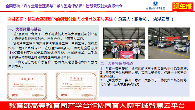 2022年6月18日,教育部产学合作协同育人聊车城项目启动会暨2022年全国高校汽车金融管理师与二手车鉴定评估师智慧云双创大赛开幕式如期举办。本届大会以“线上+线下”相结合的方式举办,线上通过腾讯会议室参会,并在重庆设立主会场。会议主题为“科技熔铸新金课·实践育人创未来”,会议共邀请来自全国各省市61名高校领导、教师及汽车产业学者、行业专家、名企高管参加。我校伟德国际1949始于英国的张治龙老师代表项目组成员参加了此次盛会,并代表项目组分享了项目建设经验。