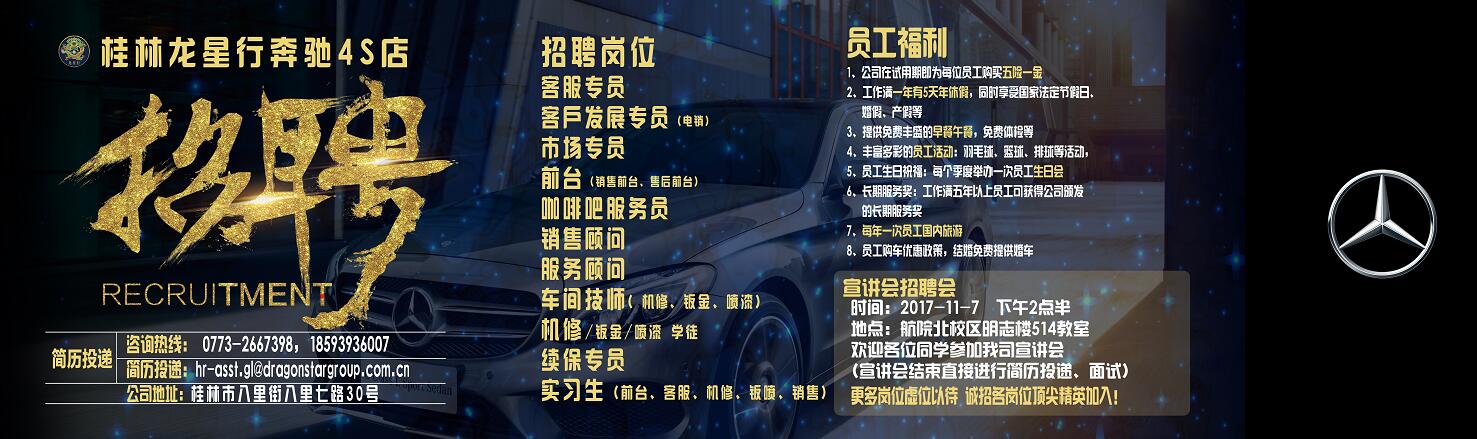 其中桂林龙星行奔驰4s店属于我们汽车与交通工程学院的专场招聘会,详情点击附件查看。请大家多关注。目前阶段是就业高峰期,请大家积极参与,珍惜机会!