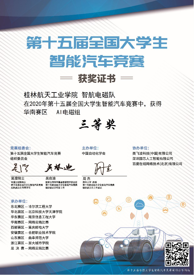 8月14日,2020年第十五届全国大学生智能汽车竞赛(华南赛区)比赛在桂林电子科技大学成功落下帷幕,来自广西地区各大高校的多支代表队展开了激烈的角逐,我院由林霄、张瑞宾老师指导的智航电磁队获得AI电磁组(华南赛区)三等奖,由龙云泽、闫军老师指导的智航飞驰队获得双车接力组(华南赛区)三等奖。