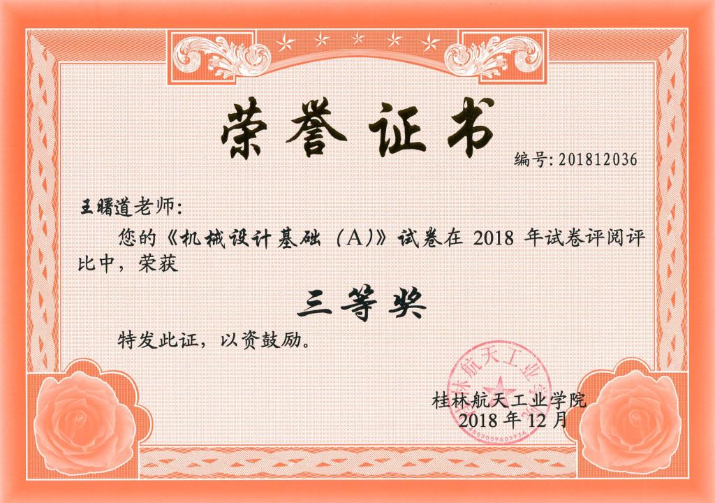 我院教师王曙道在2018年试卷评阅评比中荣获三等奖