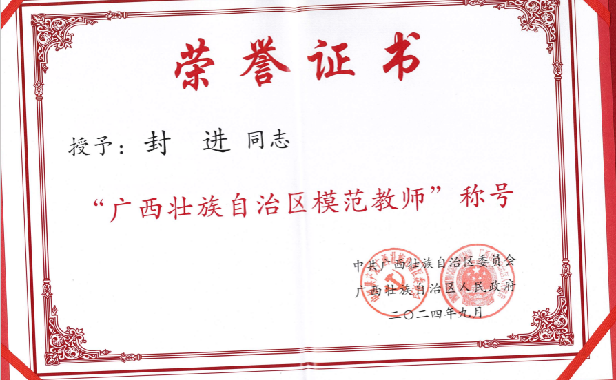 我院教师封进被自治区党委、自治区政府授予广西壮族自治区模范教师荣誉