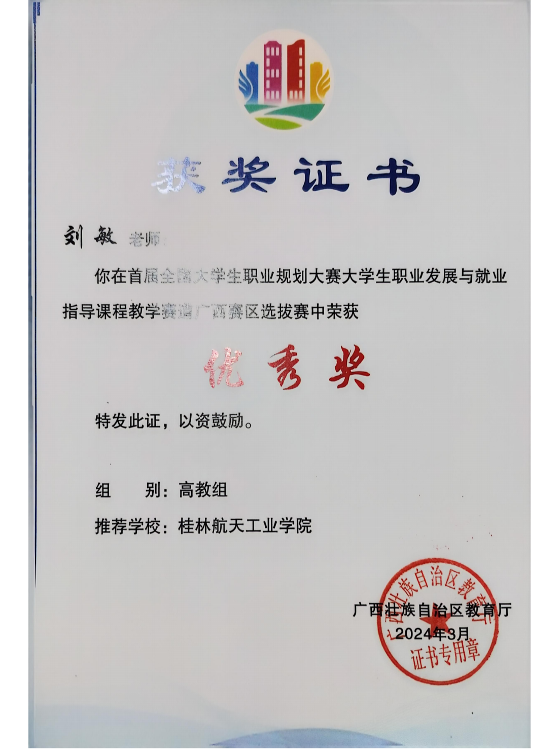 我院教师刘敏在首届全国大学生职业规划大赛大学生职业发展与就业指导课程教学赛道广西赛区选拔赛中荣获优秀奖