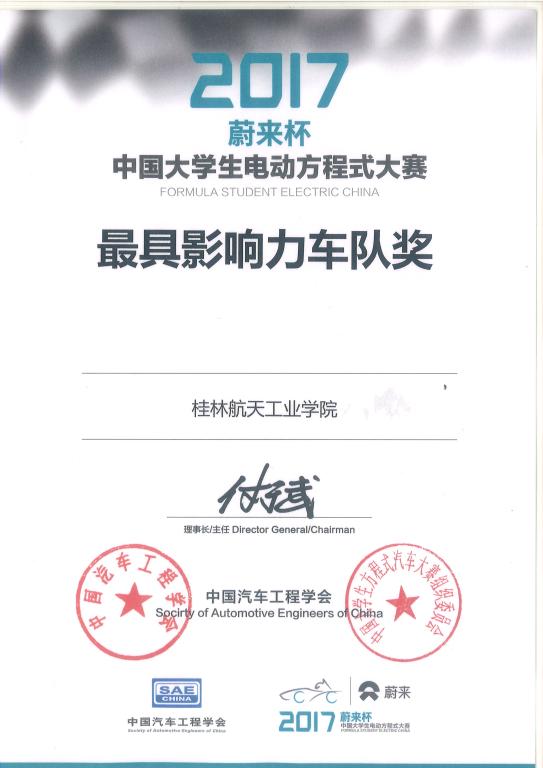 桂林航天工业学院航V车队荣获2017蔚来杯中国大学生电动方程式大赛最具影响力车队奖