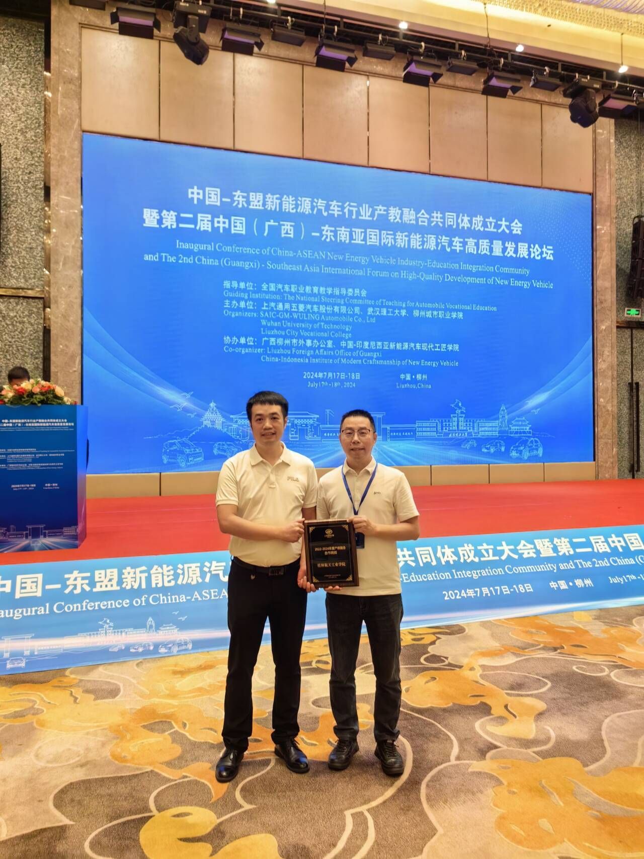 7月17日至18日,中国-东盟新能源汽车行业产教融合共同体成立大会暨第二届中国(广西)-东南亚国际新能源汽车高质量发展论坛在广西柳州市举行。我院副院长莫德赟、新能源汽车工程专业负责人封进参加了会议。