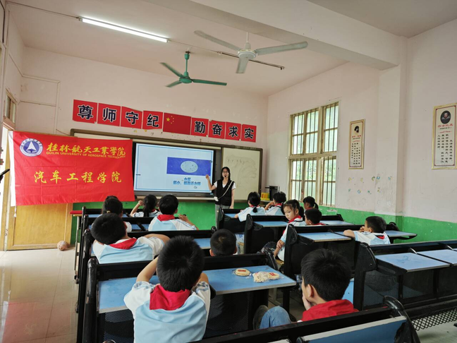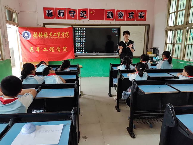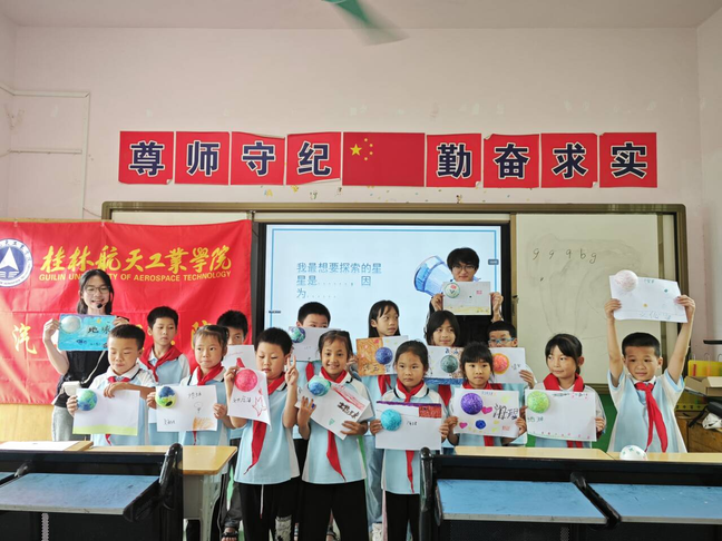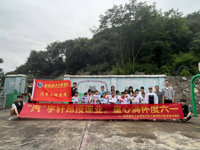 学生志愿者们怀揣着宣传航空航天精神与汽车文化的热忱一同走近了玉溪小学,与当地的孩子们共度一个愉快的六一儿童节。此次活动通过寓教于形的方式,科普航空航天知识,宣传桂林航天工业学院吃苦耐劳的航空航天精神以及汽车文化品质,绘画出遨游太空的宏伟蓝图,让孩子们探索美好蓝天,筑梦未来,插上放飞理想的翅膀。在这个欢乐的六一儿童节,为孩子们送上一份美好的节日祝福,当地驻村书记马艳红老师说到:“儿童是国家的未来,关注儿童成长也是关注我们的未来!”